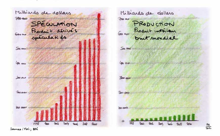 1) Speculation (hedge derivatives) vs Production (global GDP) in billions of dollars :