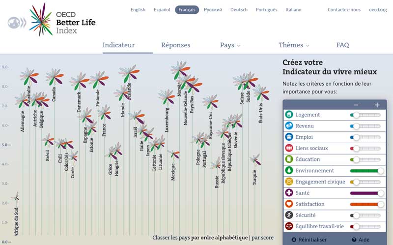 Votre vie ne se résume pas aux froids chiffres du PIB et autres statistiques économiques. Utilisez notre outil interactif et comparez les pays en fonction de l’importance que vous accordez aux différents critères du bien-être: